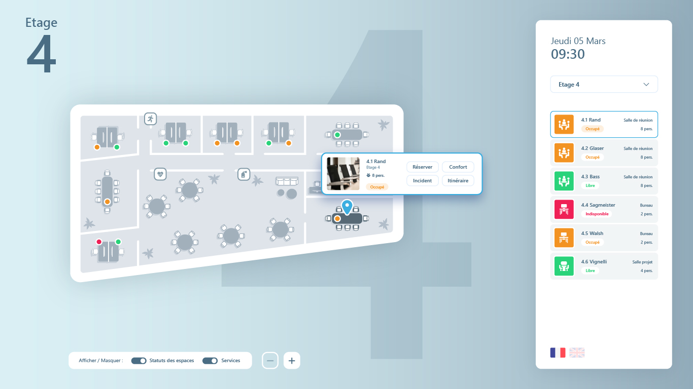 • Des plans 3D – KD Map, déployés à chaque étage, offrent une visualisation claire des disponibilités pour une réservation instantanée des espaces.